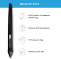 - Pen included: Thanks to battery-free Wacom Pro Pen 2 with 8,192 pressure levels & 60° tilt recognition, your Wacom drawing tablet ensures maximum precision & natural feeling. Additional 6 standard & 4 felt Wacom pen nibs stored inside pen stand