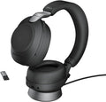 - Scope of delivery: Jabra Evolve2 85 wireless headset with desk stand, USB-A Bluetooth adapter, 1.2m USB-C to USB-A cable, 3.5 mm jack audio cable, carry case – Weight: 286g – Dimensions: 198.6 x 160 x 77,3 – Colour: Black