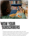 • فيديو مذهل بدقة 4K UHD: أبهر جمهورك بمحتوى 4K UHD الخالي من الاهتزاز، حتى في ظروف الإضاءة المنخفضة؛ بالإضافة إلى ذلك، يمكنك بسهولة تطبيق المرشحات والتأثيرات الإبداعية لأسلوب التوقيع.