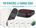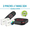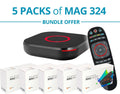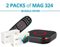- جهاز فك التشفير MAG324 ، دليل المستخدم ، كابل HDMI ، محول طاقة 12 فولت 1 أمبير ، جهاز تحكم عن بعد ، بطاريتان AAA ، عبوة