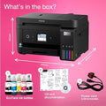 - KEEP ON SAVING - This economical printer saves you up to 90% on printing costs* and comes with an extra black ink bottle for up to 3 years' worth of ink included in the box*. One set of ink bottles delivers up to 14,000 pages in black and 5,200 in colour*, equivalent of up to 72 cartridges worth of ink*