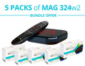 - MAG324W2 Set-Top Box, User Manual, HDMI cable, Power adapter 12V 1A, Remote control, 2 AAA batteries, Packaging