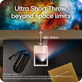 - Enjoy a grand 100-inch display, just a short distance from the wall. The ultra-short throw lens can project a variety of screen sizes—from 40-inch to a cinematic 100-inch display—even in the tightest spaces.